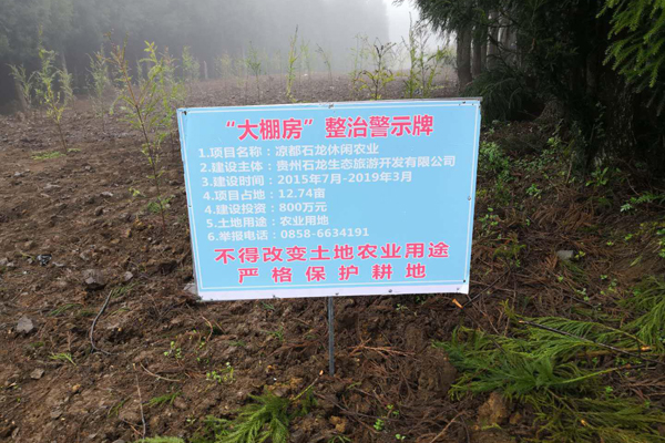 为确保“大棚房”落实整改到位,2019年4月1日钟山经济开发区国土资源分局到到石龙三组“石龙生态园”督查,查看整改情况,目前,该“大棚房”涉及建筑物已拆除完毕,并已复土复耕。(钟山经济开发区国土资源分局)