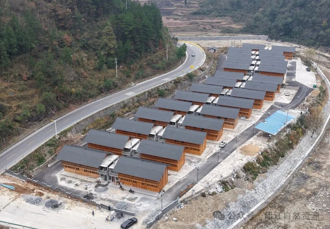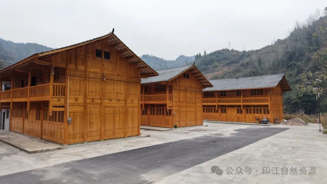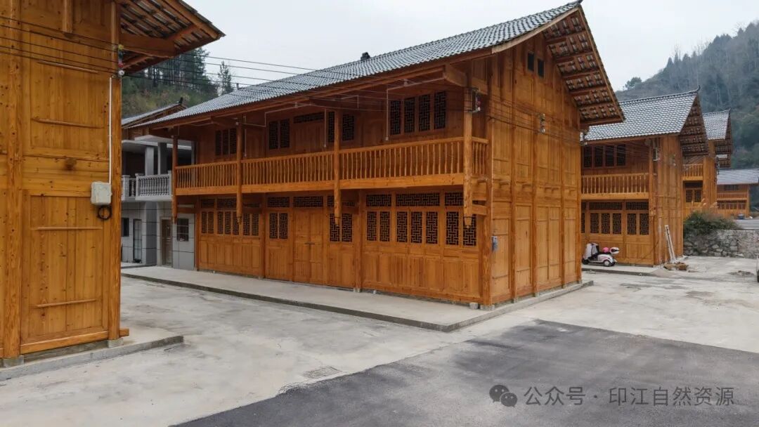 “该搬迁点采取‘统规联建’模式,由政府统一规划,搬迁群众联合建设,积极发挥群众主体作用,由搬迁群众代表成立自建委,负责选定项目方案、施工队伍,参与施工质量安全监管、资金监管、矛盾纠纷调解、工程验收等工作,全程参与项目建设。为凸显乡村风格特色,将房屋整体风格设计为木质结构2层独栋房屋,厨房、卫生间设计为砖混结构,每栋楼之间保留了足够的消防通道,安置区规划整齐,道路宽敞。已争取住建、水务、生态环境等部门人居环境改善资金,完善项目消防、排水、绿化等配套设施,争取建成一个功能齐全、群众满意的地灾搬迁安置点,并结合梵净山西线传统村落集中连片保护利用示范区,打造省级乡村旅游重点村。”印江县自然资源局主要负责人说道。图为合水镇落佑村桃子坪组地质灾害避险搬迁安置房近景