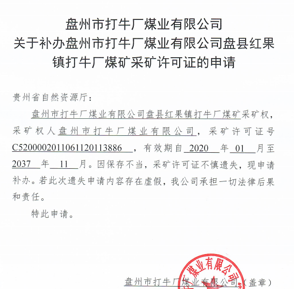 附件:盘州市打牛厂煤业有限公司关于补办盘州市打牛厂煤业有限公司盘县红果镇打牛厂煤矿采矿许可证的申请