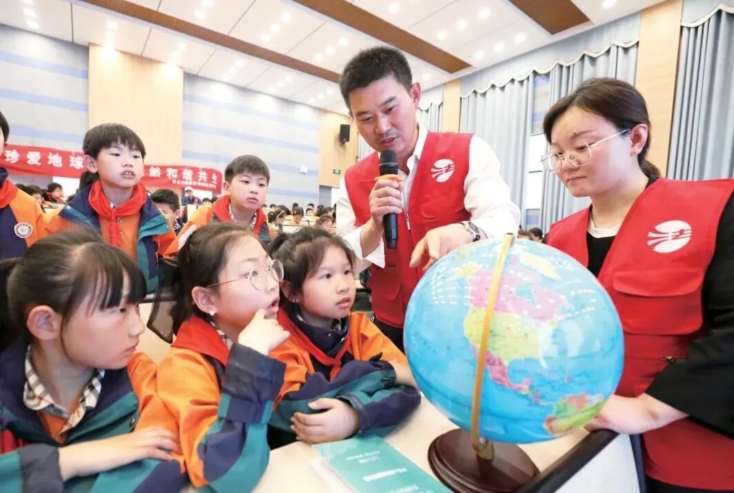 4月19日,安徽省淮北市自然资源和规划局等部门志愿者在曲阳学校开展世界地球日宣传活动,为同学们讲解地球科学知识。李鑫 秦旺旺 文/摄