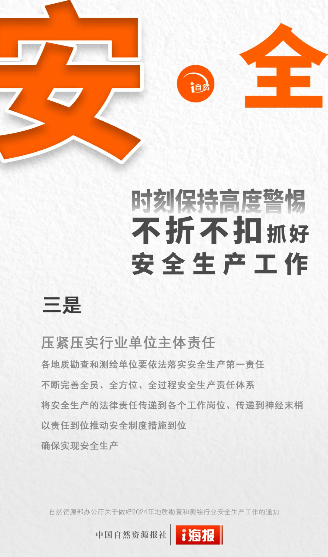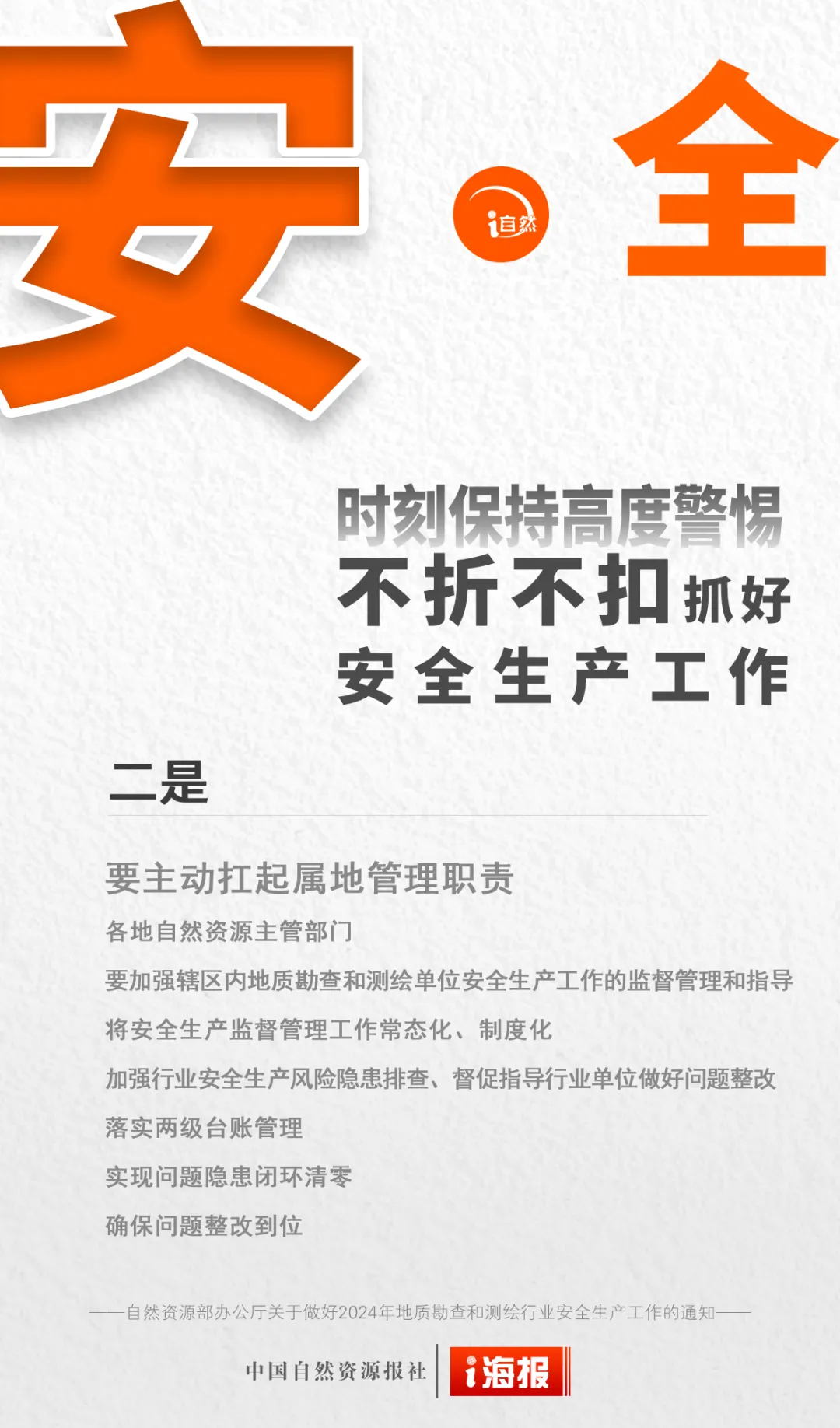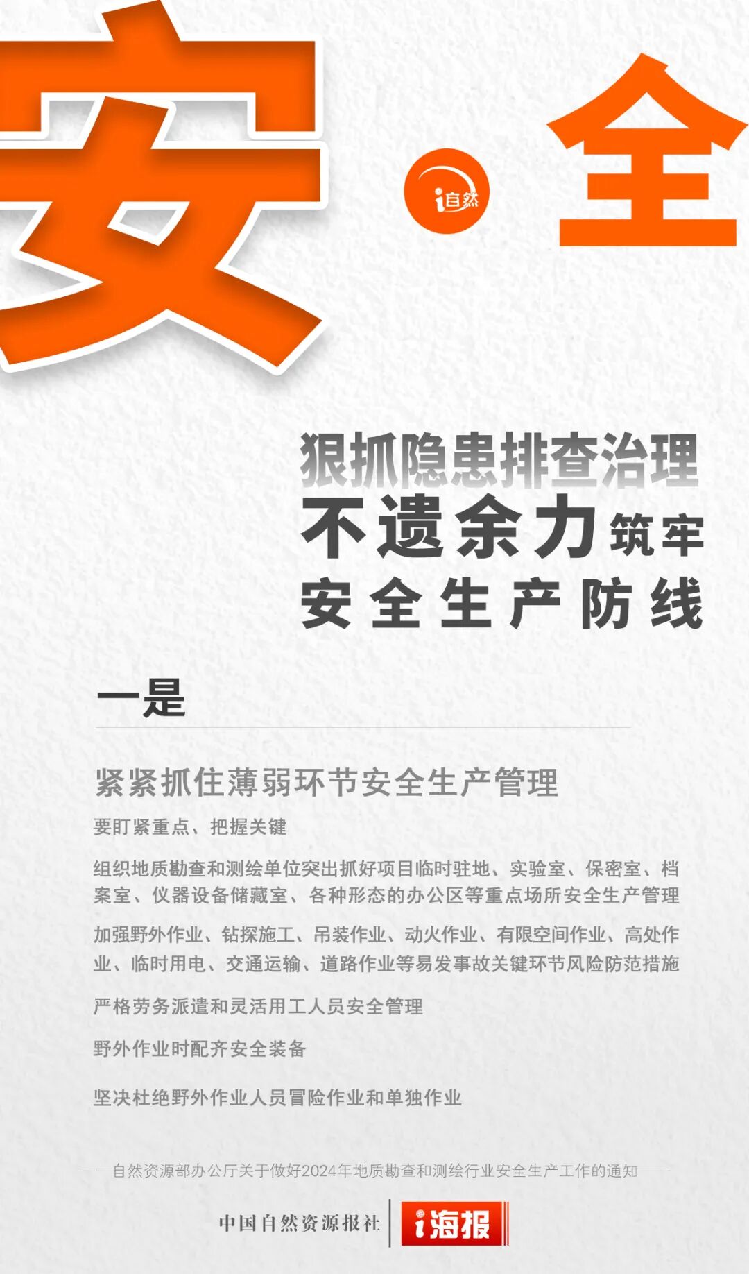 2024年是中华人民共和国成立75周年,是实现“十四五”规划目标任务的关键一年,做好安全生产工作责任重大。为深入贯彻落实习近平总书记关于安全生产系列指示批示精神和党中央、国务院加强安全生产有关决策部署,抓紧抓实地质勘查和测绘行业安全防范和管理工作,确保行业安全生产形势持续稳定,《自然资源部办公厅关于做好2024年地质勘查和测绘行业安全生产工作的通知》印发。