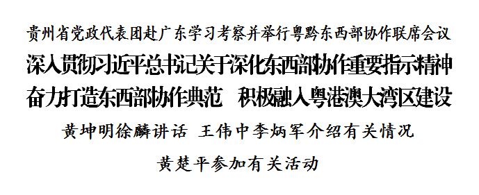 为进一步深入学习贯彻习近平总书记关于深化东西部协作的重要指示精神和在新时代推动西部大开发座谈会上的重要讲话精神,持续深化粤黔协作,打造东西部协作典范,积极对接融入粤港澳大湾区建设,6月3日至4日,贵州省党政代表团赴广东学习考察。4日下午,两省在广州举行粤黔东西部协作联席会议。广东省委书记黄坤明主持会议并讲话。贵州省委书记、省人大常委会主任徐麟讲话。广东省委副书记、省长王伟中,贵州省委副书记、省长李炳军分别介绍两省经济社会发展和粤黔东西部协作工作情况。广东省人大常委会主任黄楚平参加有关活动。