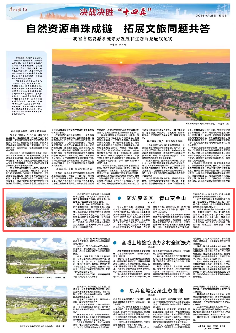 近年来,金沙县政府和自然资源管理部门坚持把生态修复与产业发展相结合,通过土地复垦、地灾治理、生态修复等手段恢复了矿山生态功能,使得工业遗产价值与独特地貌景观被重新挖掘。如今,废弃矿坑变身人工景观湖,生态观光农业、科普教育、户外体验等多元旅游业态在这里蓬勃发展。