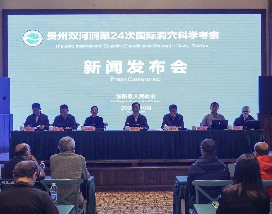 10月24日,贵州绥阳双河洞第24次国际洞穴科学考察成果发布会在双河洞国家地质公园举行。本次活动由绥阳县人民政府与贵州科学院院属贵州省山地资源研究所共同主办。贵州省山地资源研究所党委委员、副所长周文龙与法国洞穴联盟驻中国代表让·波塔西联合发布了最新探测数据与科研成果。来自绥阳县、贵州省山地资源研究所的相关负责人,中外洞穴科考专家及多家媒体记者共同参会。