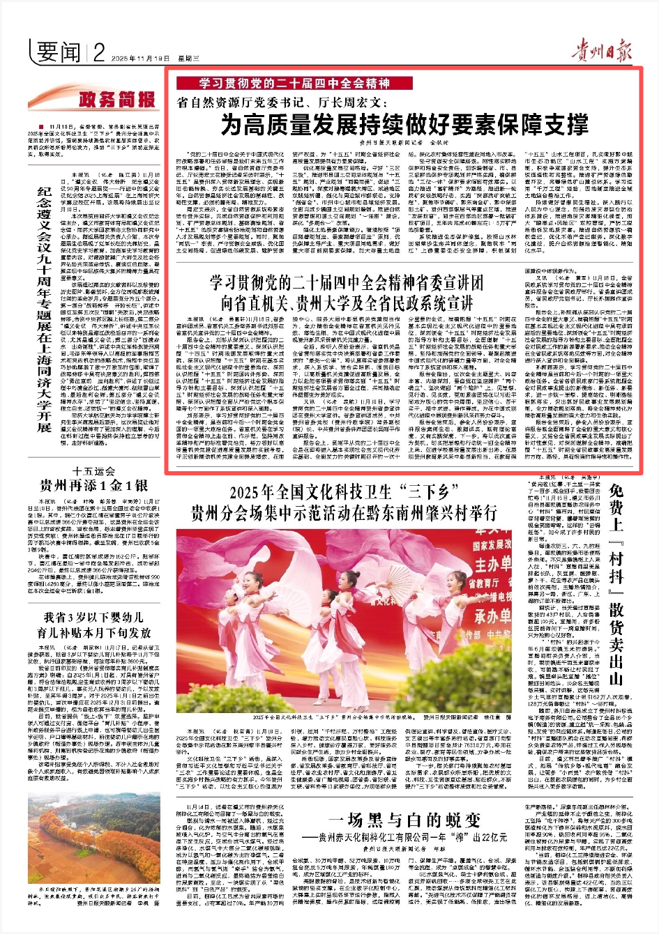 周宏文表示,全省自然资源系统将紧密结合贵州实际,完成自然资源保护和利用规划、矿产资源总体规划、基础测绘规划、省“十五五”地质灾害综合防治规划和自然资源人才发展规划等多个重要规划。同时,聚焦“两统一”职责,严守资源安全底线、优化国土空间格局、促进绿色低碳发展、维护资源资产权益,为“十五五”时期全省经济社会高质量发展提供有力要素保障。