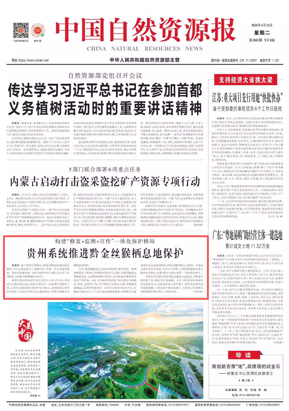 中国自然资源报头版|贵州系统推进黔金丝猴栖息地保护