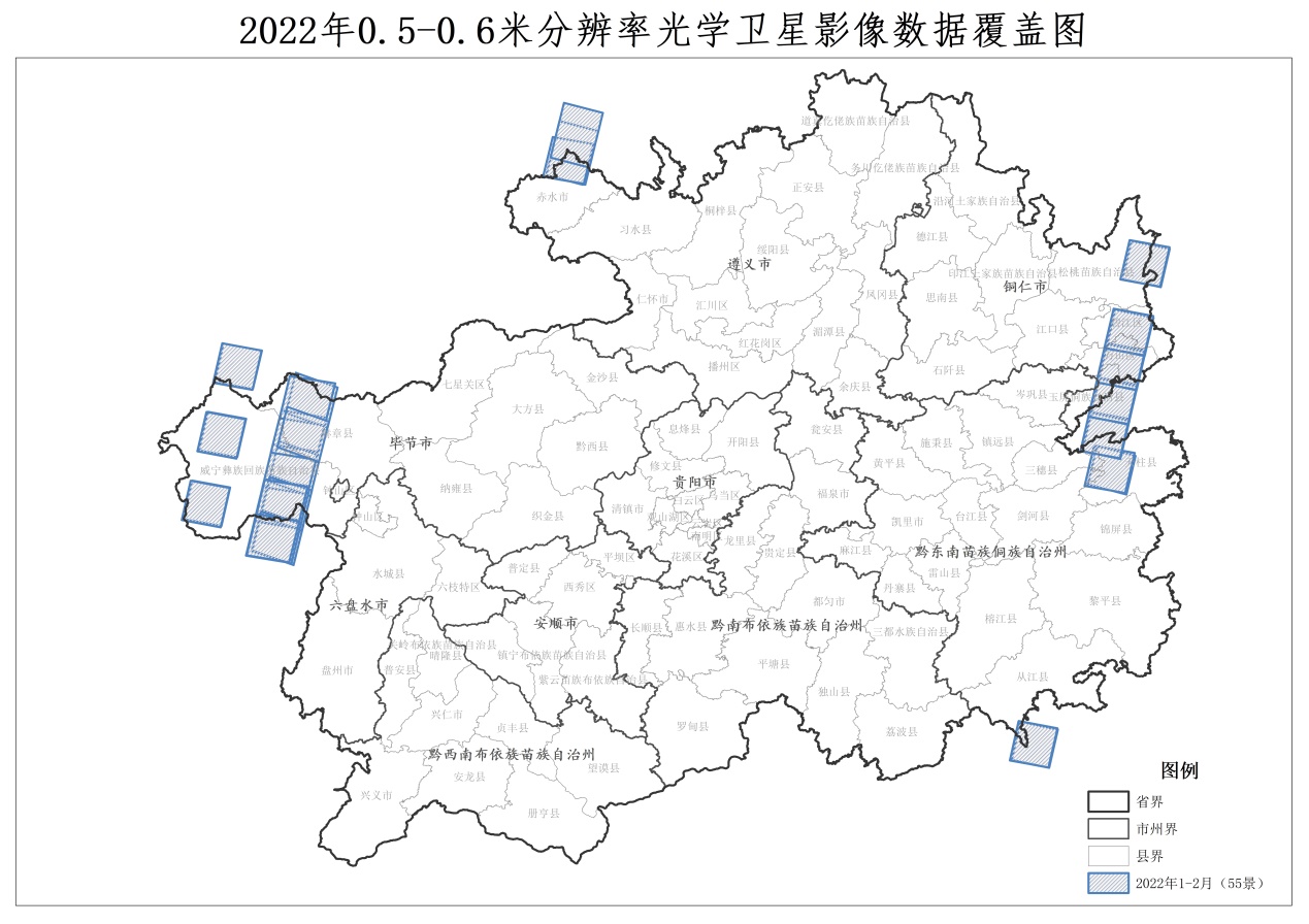 共计获取0.5-0.6米分辨率光学卫星遥感影像55景,数据量53.02 GB,累计面积3.51万平方公里,省内实际覆盖面积0.63万平方公里。以上数据皆为2月新增。具体覆盖情况如下图: