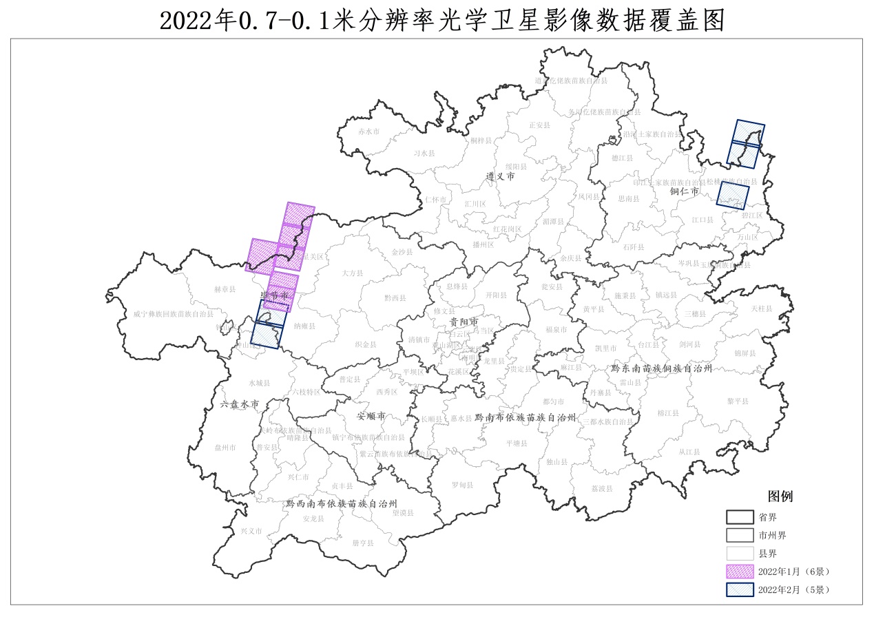 共计获取0.7-1米分辨率光学卫星遥感影像11景,数据量11.04GB,累计面积0.6万平方公里,省内实际覆盖面积0.34万平方公里。其中,2022年2月获取的5景,数据量4.83 GB,累计面积0.27万平方公里,省内实际覆盖面积新增0.18万平方公里,具体覆盖情况如下图: