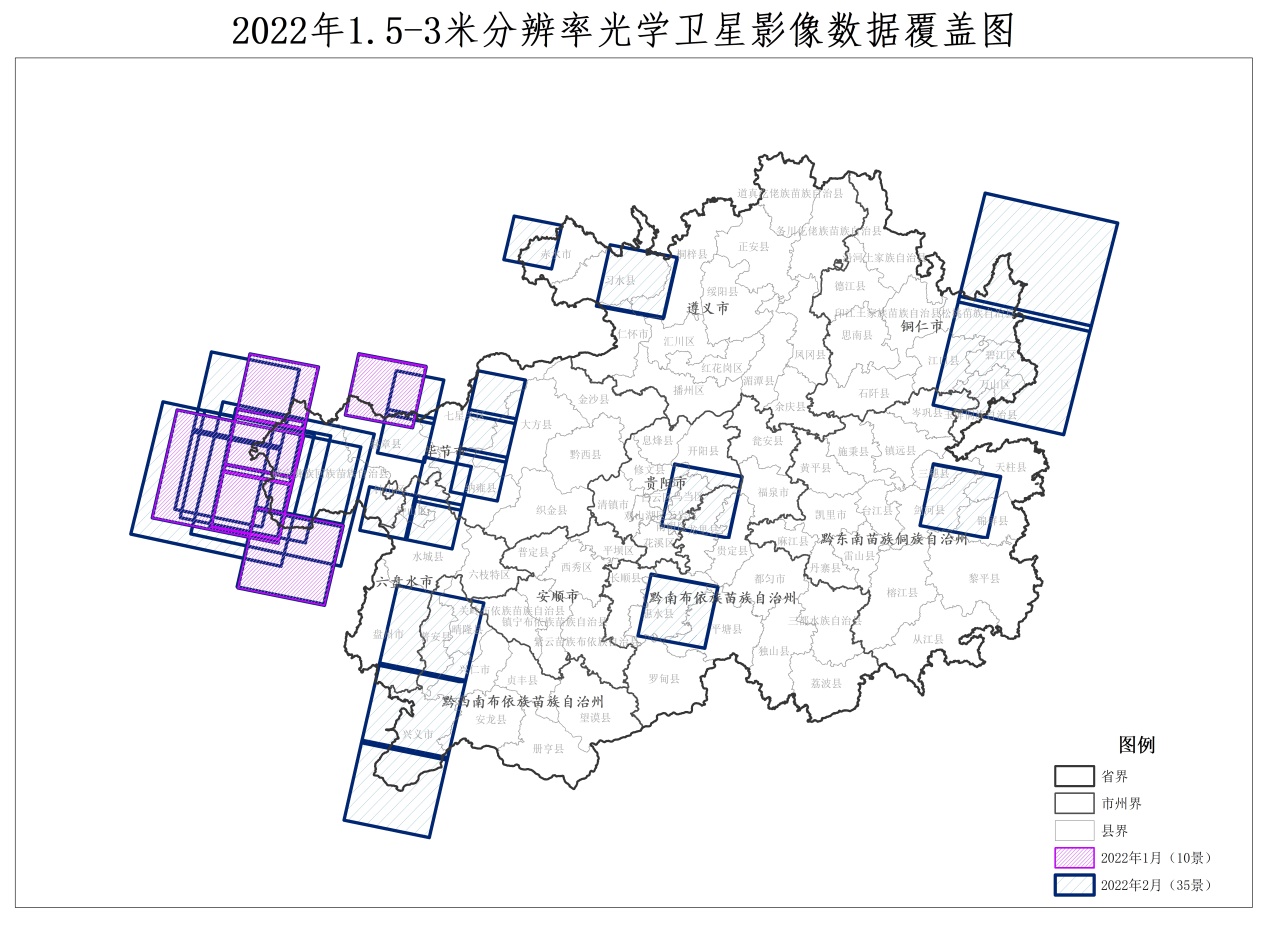 共计获取1.5-3米分辨率光学卫星遥感影像45景,数据量53.29GB,累计面积16.21万平方公里,省内实际覆盖面积3.84万平方公里。其中,2022年2月获取的35景,数据量43.38 GB,累计面积12.87万平方公里,省内实际覆盖面积新增3.59万平方公里,具体覆盖情况如下图: