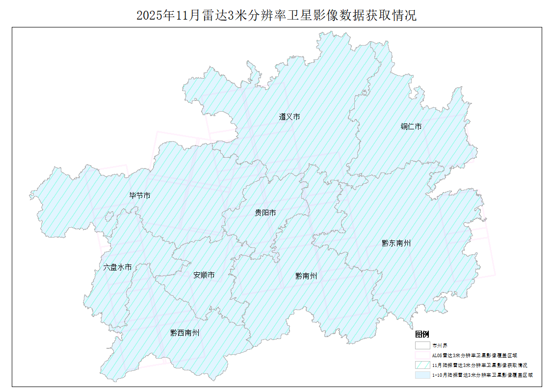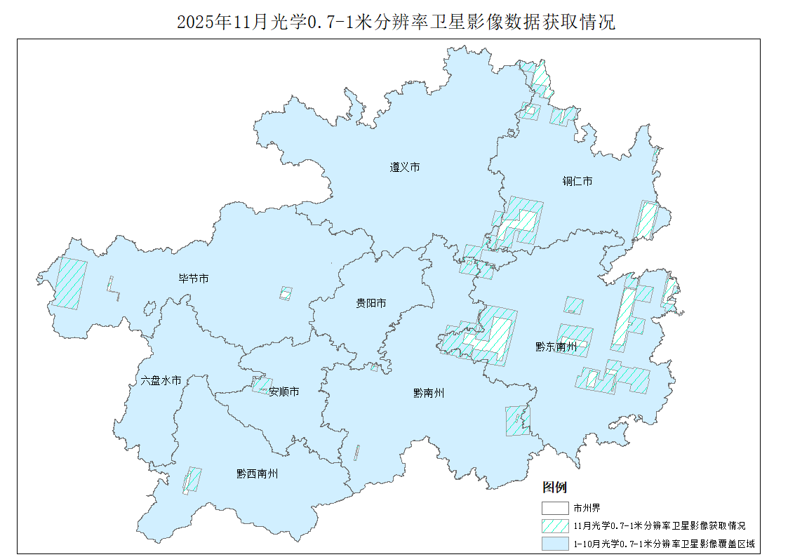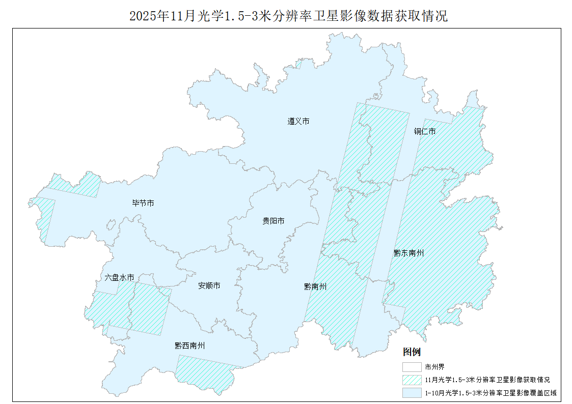 至11月20日,全年获取光学0.7-1米分辨率卫星遥感影像共1738景,数据量1897.87GB,省内实际覆盖面积17.60万平方公里,占全省面积100%。11月获取82景,数据量164.96GB,省内实际覆盖面积1.43万平方公里。11月获取与全年已获取省内面积重复覆盖1.07万平方公里。具体覆盖情况如下图: