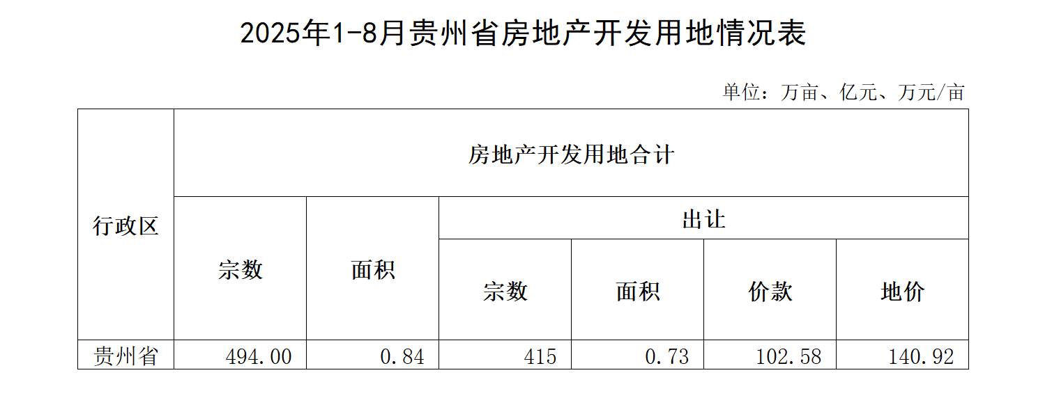 2025年1-8月贵州省房地产开发用地情况表