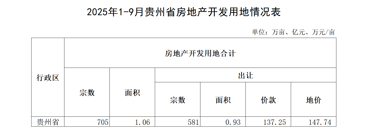 2025年1-9月贵州省房地产开发用地情况表