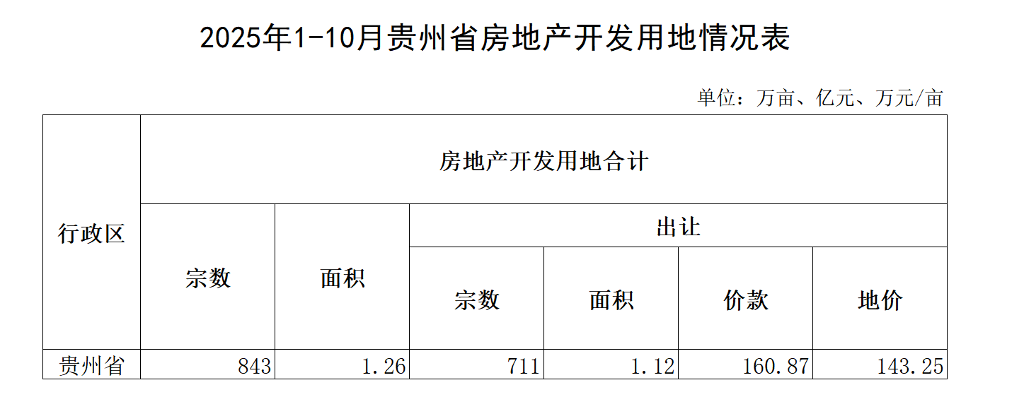 2025年1-10月贵州省房地产开发用地情况表