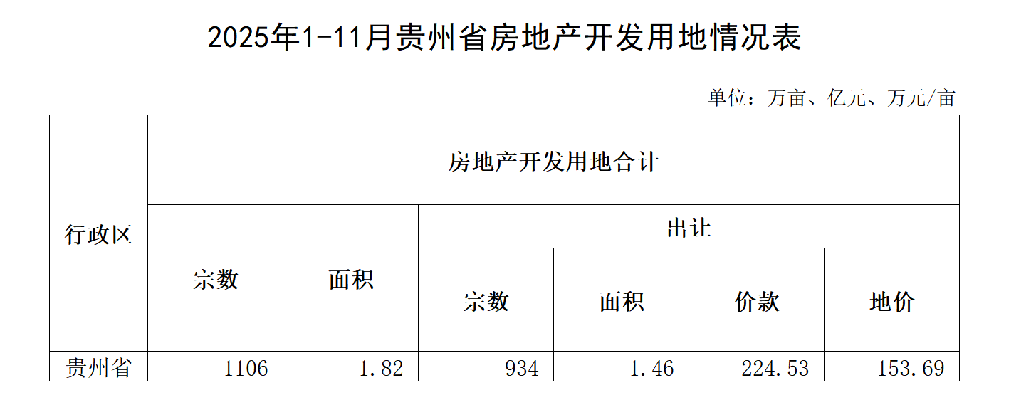 2025年1-11月贵州省房地产开发用地情况表