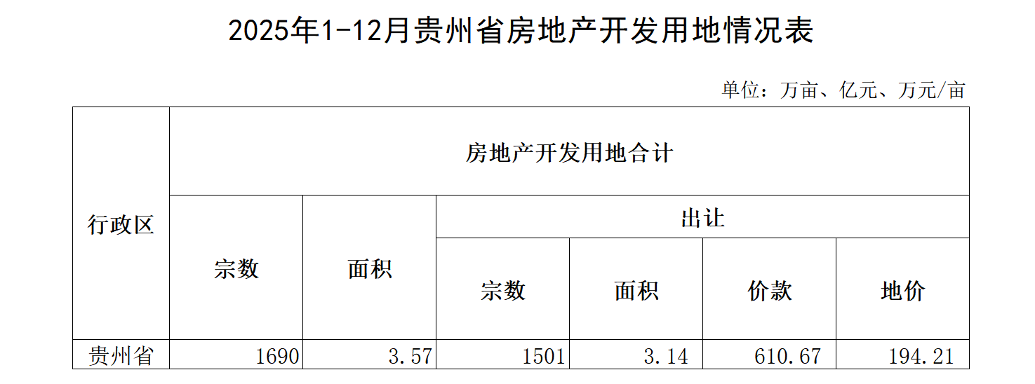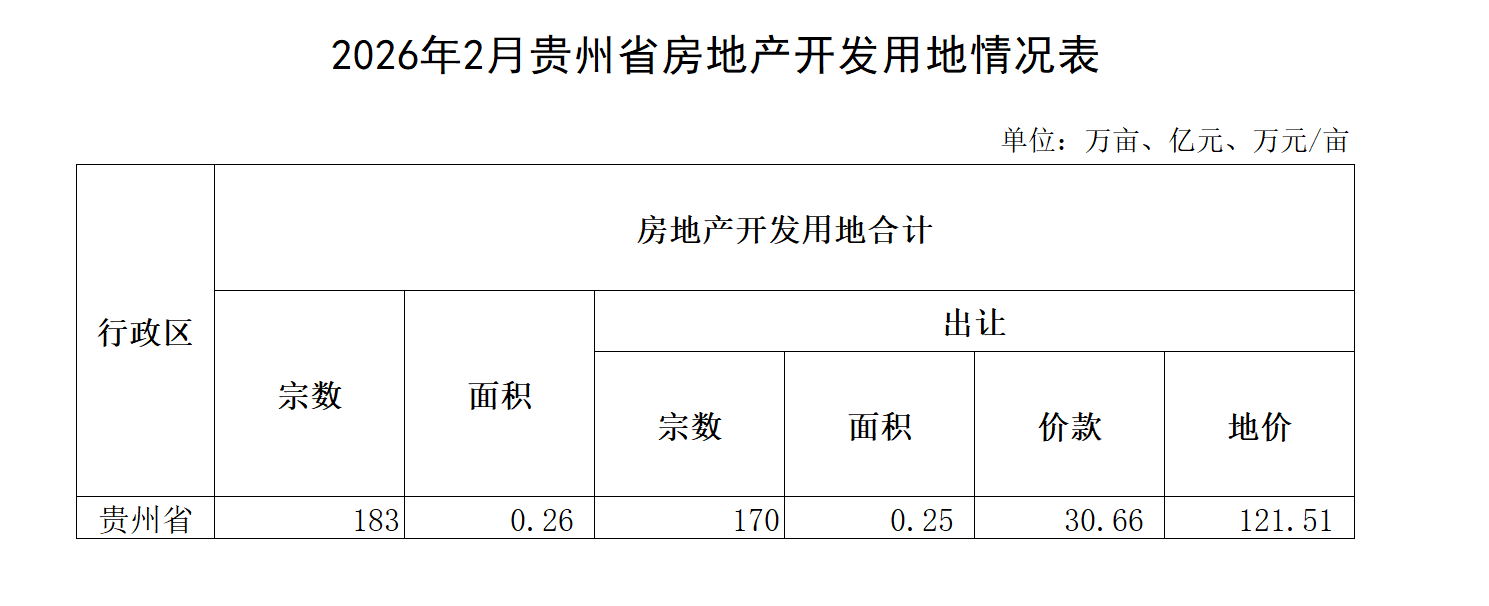 2026年2月贵州省房地产开发用地情况表