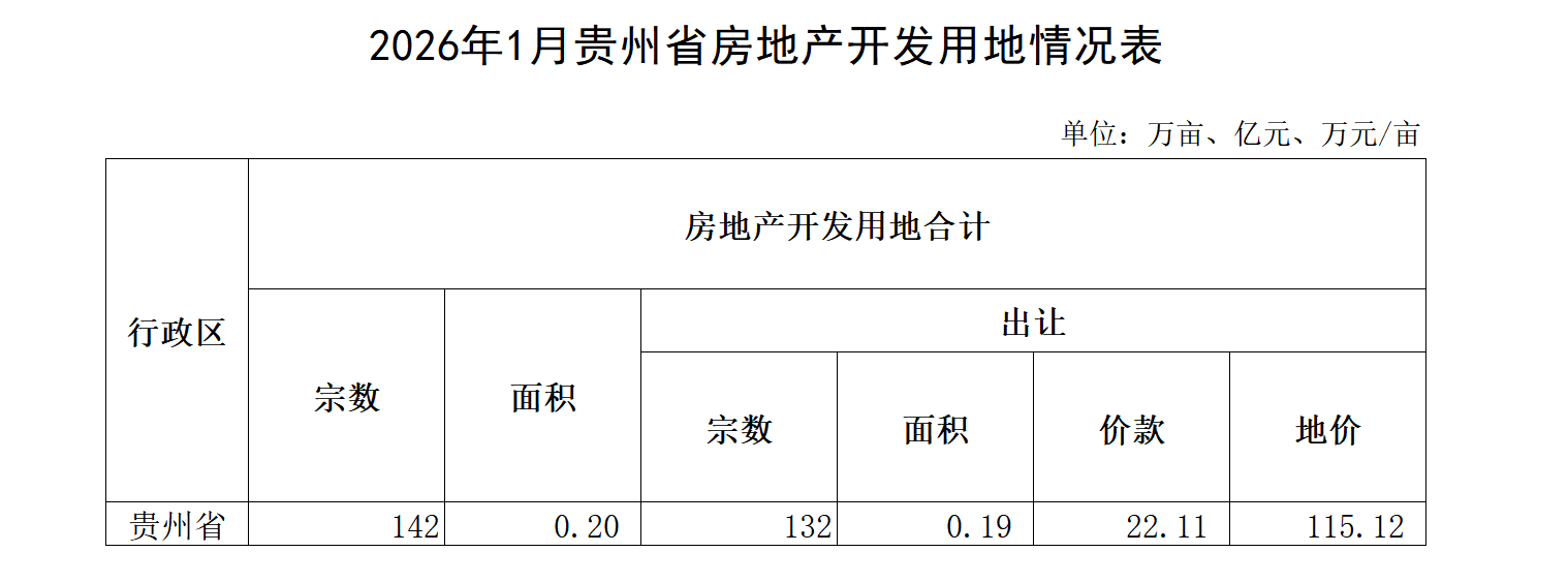 2026年1月贵州省房地产开发用地情况表